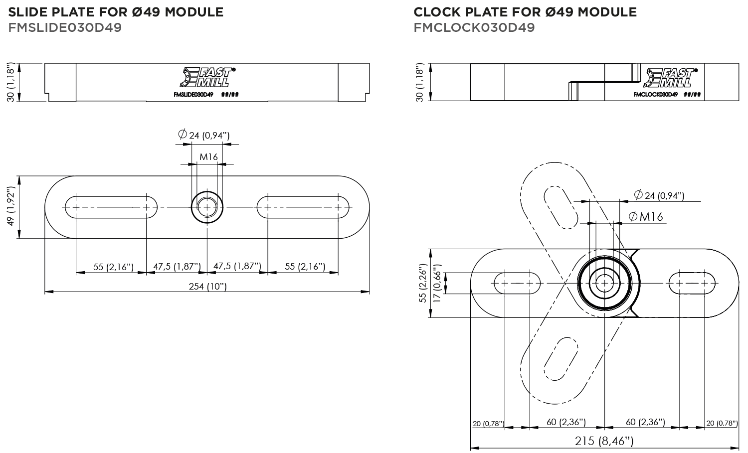 Le soluzioni di slide e clock FastMill per modulo D49 permettono il fissaggio sulla griglia della piastra di un componente su cui non è possibile mantenere una foratura e una lamatura a passo 50mm: Massima flessibilità di bloccaggio e possibilità di utilizzare fori esistenti sul pezzo.