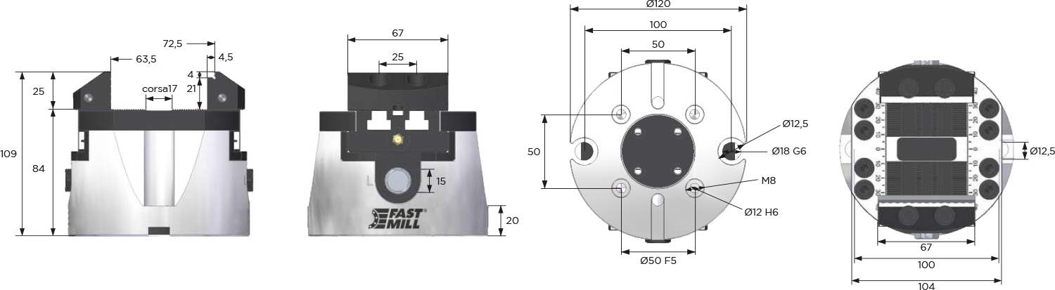 Fissaggio: compatibile con punti zero in commercio o direttamente su tavola meccanica. Funzionamento: cinematismo comandato da doppia vite con filettatura trapezoidale destra e sinistra.